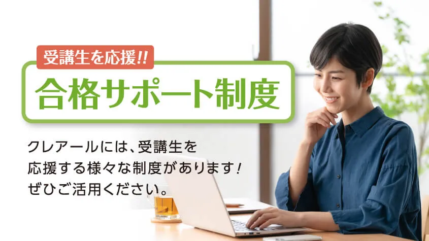 さらに、クレアールの講座は「コストパフォーマンスが高い」と好評です。質の高い講義と教材、手厚いサポートがそろっていながら、受講料は他の大手講座と比べてリーズナブルに設定されています。また、さまざまな割引制度や合格お祝い金制度など、学びやすさを支える制度も充実しています。さらに、受講料にプラス5万円の「安心保証プラン」に加入すると、万が一の結果に終わったとしても受講期間を延長することができるので安心。もちろん、合格すればこの5万円は返金されるので加入しておいて損はありません。