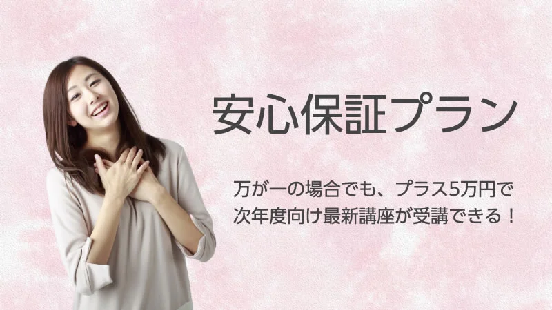 目標年度の本試験に合格された方で、合格体験記の執筆などにご協力いただくと、最大10万円を進呈(中上級コースは5万円) ◆安心保証プラン 万一の結果に終わってしまった場合でも、プラス5万円(中上級コースは3~4万円)で次年度向け最新講座が受講できる。しかも目標年度で合格した場合は安心保証料金は全額返金 |